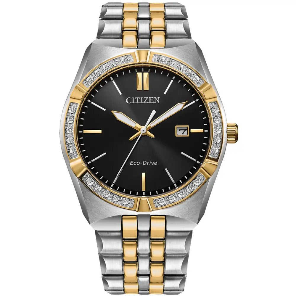 A classic timepiece is always in style in the latest addition to the Corso collection, where timeless elegance and modern technology meet. This Citizen watch features a black dial, set within a 40MM two-tone stainless steel case and bezel adorned with diamonds; it also has a matching link bracelet, Eco-Drive technology, and a water resistance of up to WR100 (10 bar or 333 feet).