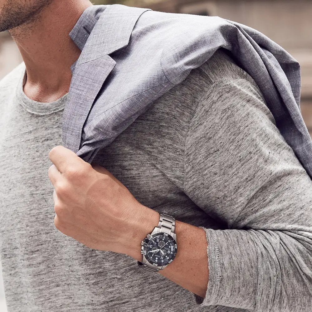 Take things up a notch with this Perpetual Calendar crafted in Super Titanium™. This Citizen timepiece features a blue chronograph dial, set within a 43MM titanium case and bezel; it also has a matching link bracelet, Eco-Drive technology, and a water resistance of up to WR 100 (10 bar or 333 feet).