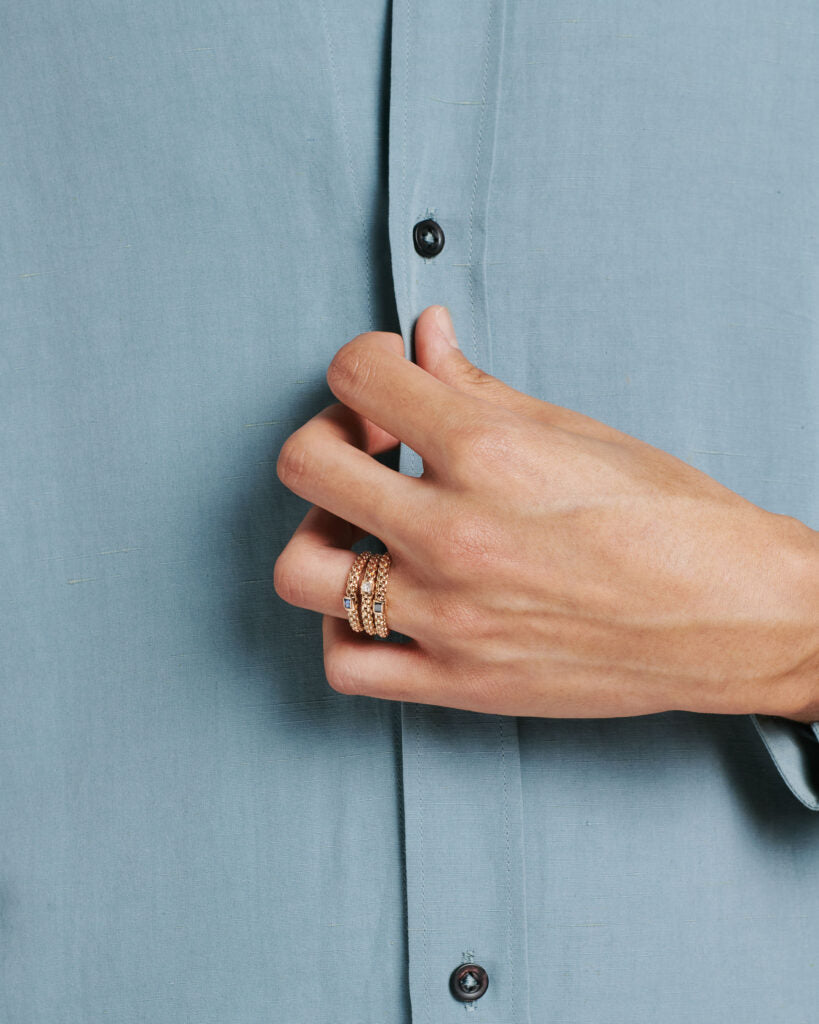 Fope's Souls ring features intricately knitted links and an eye-catching gemstone. Set in 18K yellow gold, this band features intricately knitted, rounded, and highly polished links adorned with a striking black diamond weighing 0.14CTS. For ring sizes, please inquire above.