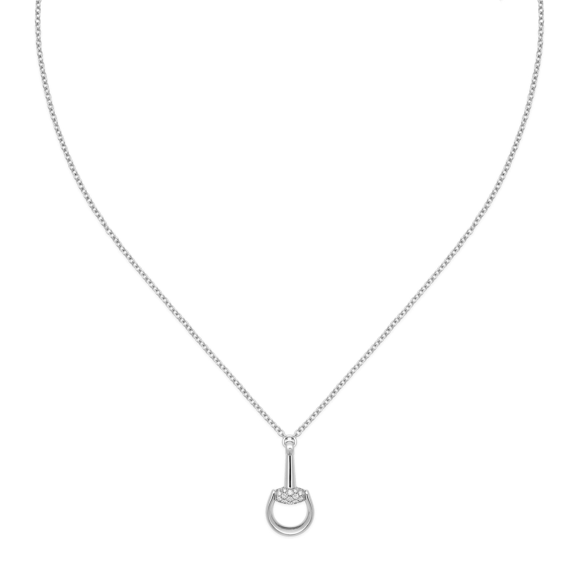 An extension of the Horsebit range includes eye-catching diamonds across a selection of white and rose gold jewelry pieces. Set in 18K white gold on a delicate and adjustable chain, this Gucci Horsebit Necklace features a smooth, highly polished pendant at its center, accented with sparkling white diamonds weighing 0.195CTS.