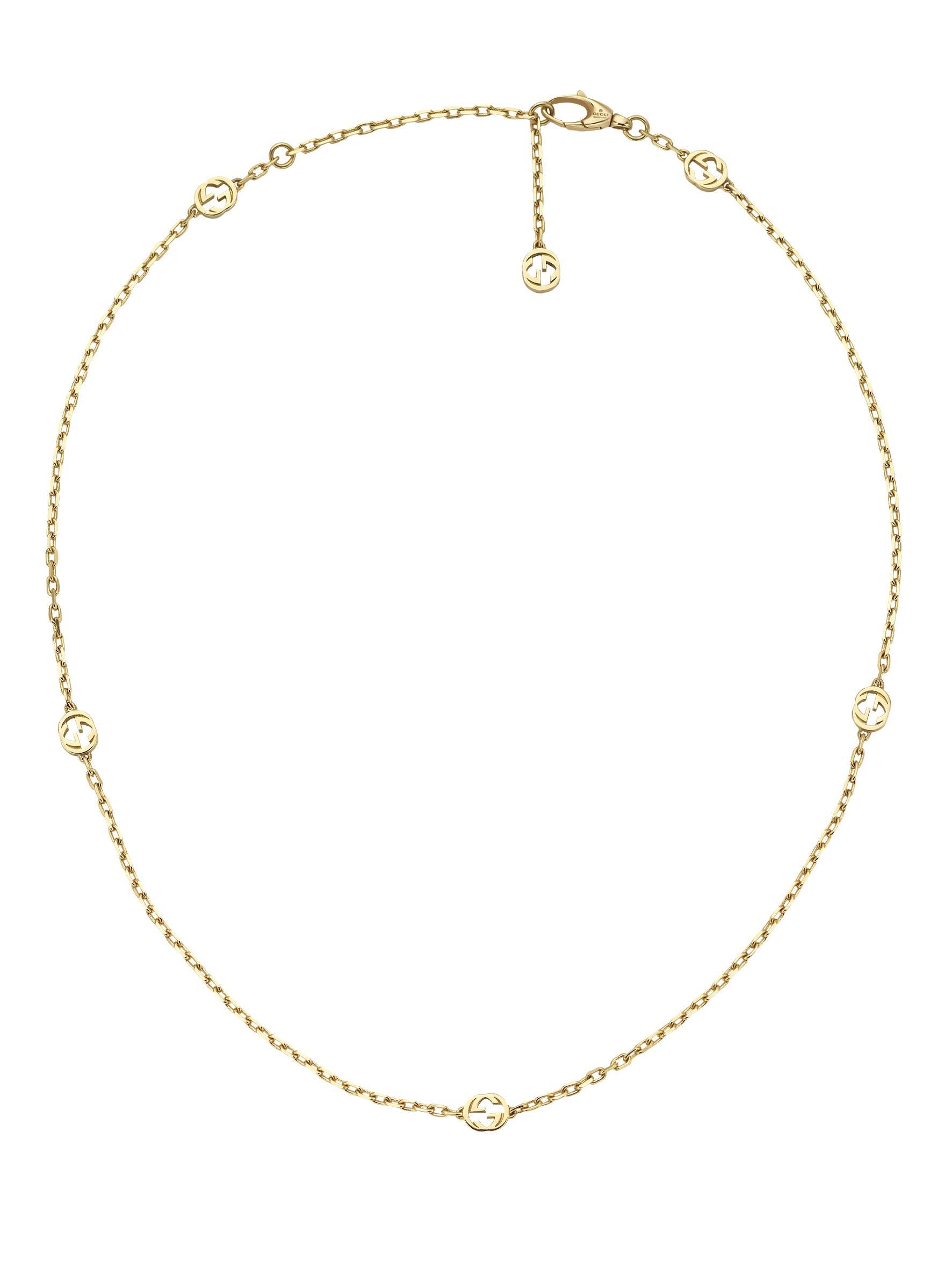 Gaining notoriety in the 1960s, the emblematic logo is representative of founder Guccio Gucci's initials and has since been reintroduced in a variety of forms and interpretations. Set in 18K yellow gold, this Gucci Interlocking G Necklace features a delicate and adjustable series of cable links adorned with the brand's iconic Interlocking G emblems.