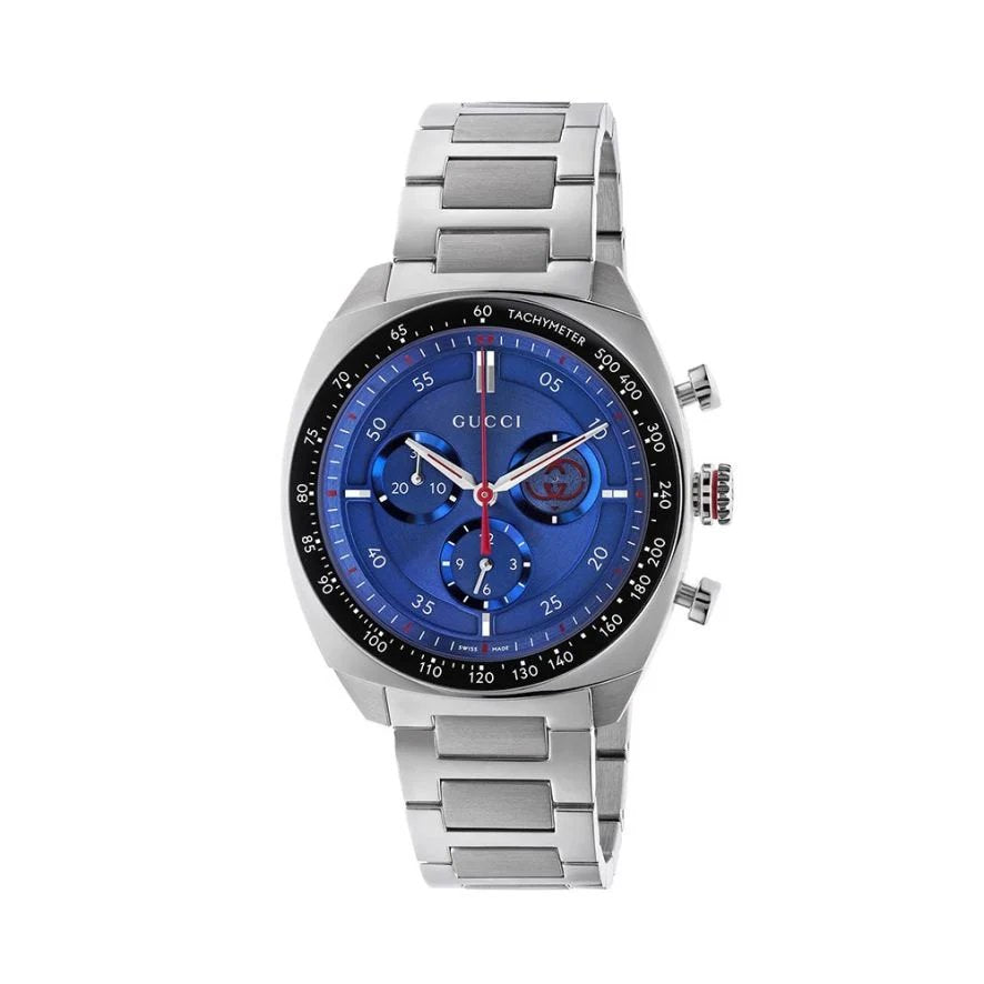 This Gucci Interlocking timepiece features a blue chronograph dial, set within a 41MM stainless steel case and black ceramic bezel; it also has a matching link bracelet, Swiss quartz-chronograph movement, and a water resistance of up to 10 ATM (100 meters or, approximately, 330 feet).