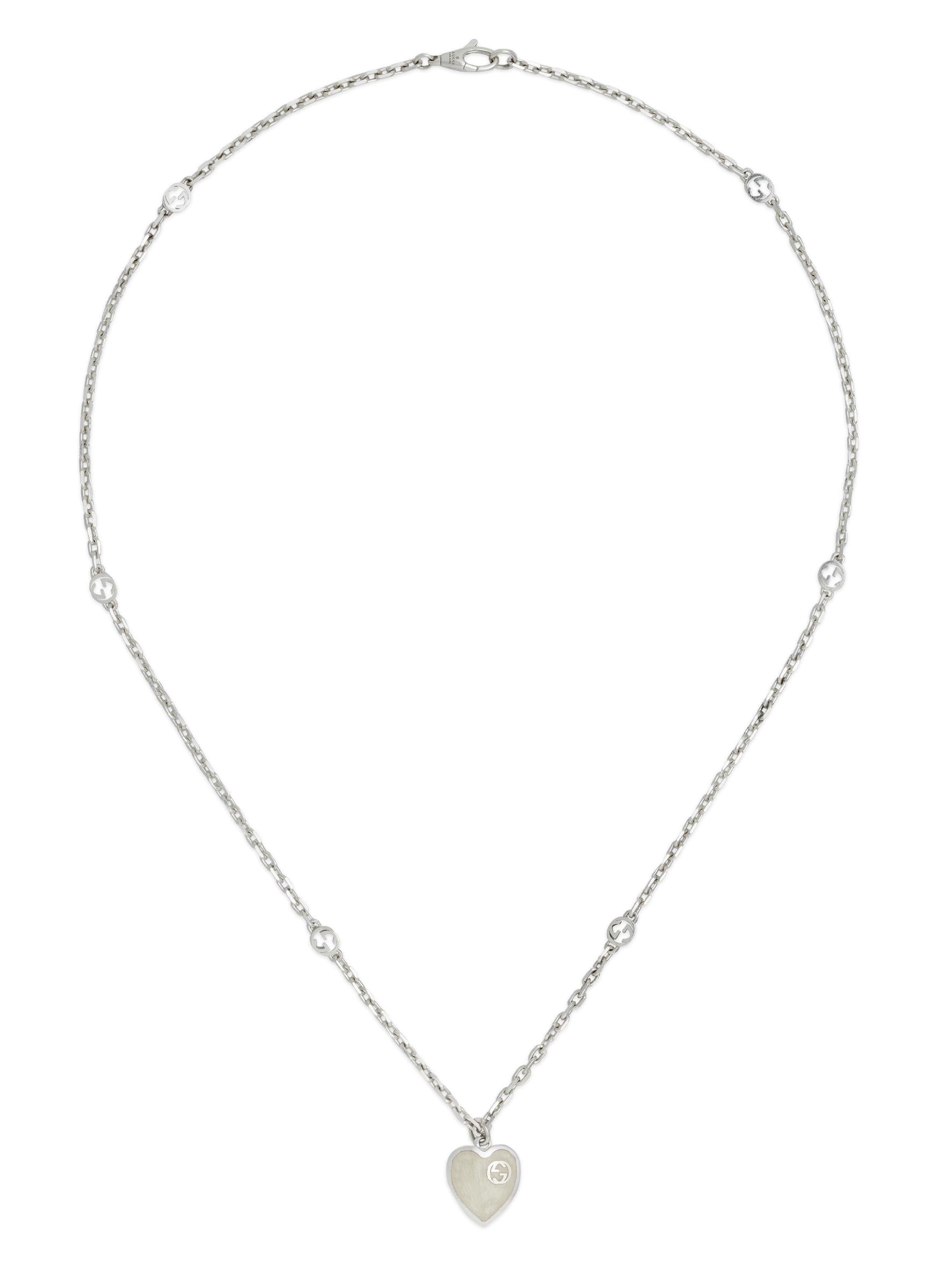 The transparency of these intricate details provides a glimpse into a world of visionary creations. Set in sterling silver, this Interlocking G Necklace features a series of smoothly polished cable links adorned with the brand's carefully spaced Interlocking G emblems; at its center sits a dangling heart pendant decorated with shimmering white enamel.