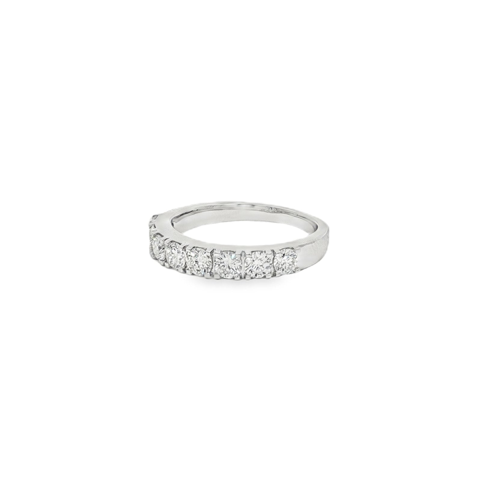 Set in 14K white gold, this Semi-pave Ring features a petite, smoothly polished, graduated band adorned with a series of eight sparkling diamonds weighing a total of 0.99CTS. For ring sizes, please inquire above.