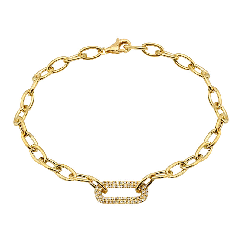 Set in 14K yellow gold, this stylish Chain Bracelet features a series of smooth, highly polished cable links adorned with a sparkling paperclip at its center, decorated with sixty-two diamonds weighing a total of 0.17CTS.