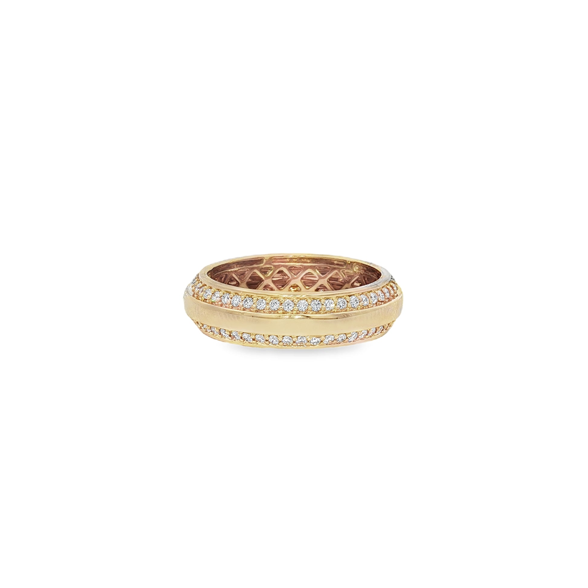 Set in 14K yellow gold, this light-catching Men's Band features two rows of over forty-six diamonds weighing a total of 0.58CTS, bordering a central, smoothly polished strand. For ring sizes, please inquire above.