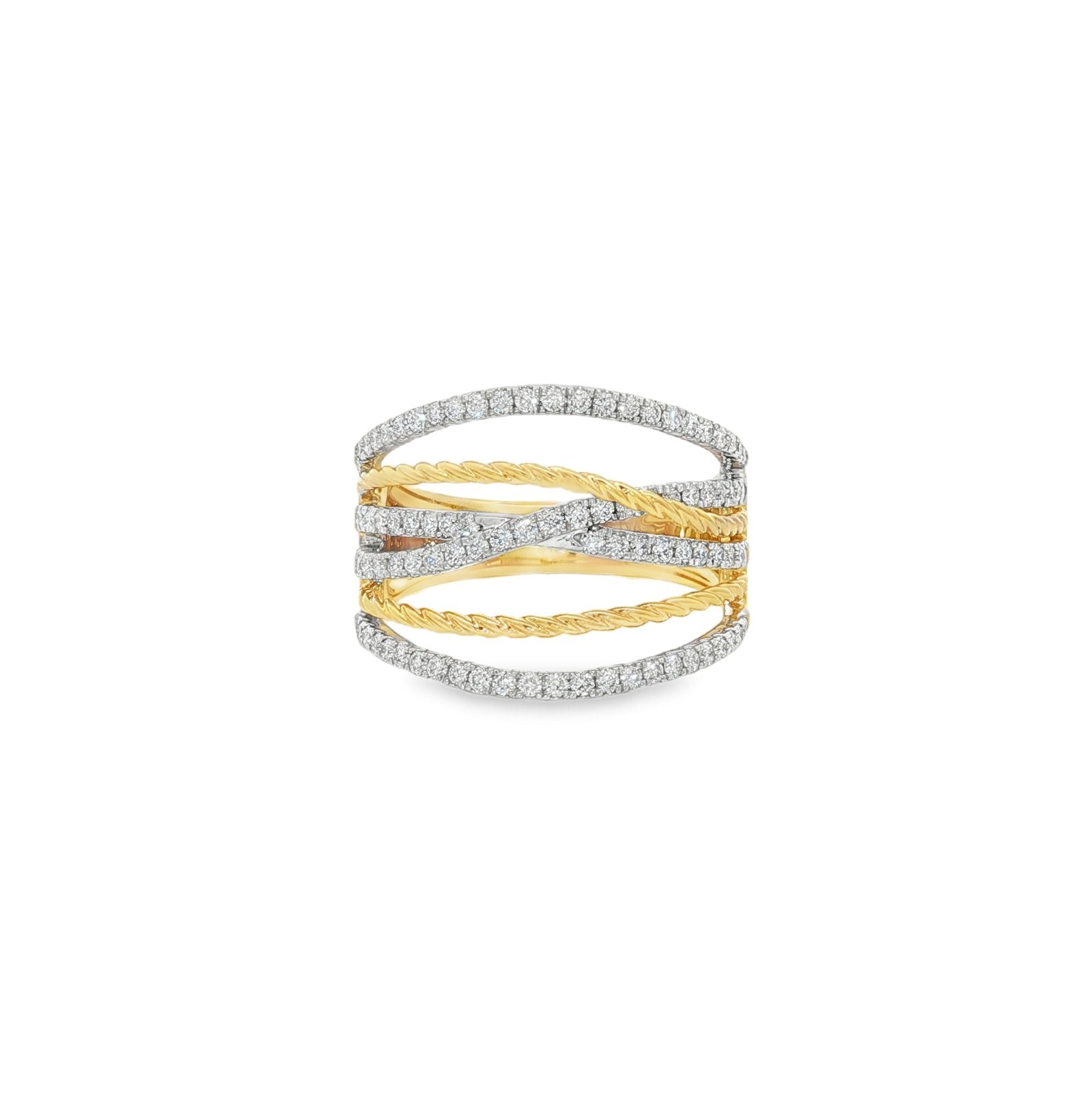 Set in 18K gold, this stylish Two-tone Diamond Ring features a band comprised of six strands: two twisted, cable-like yellow gold strands and four white gold strands decorated with ninety diamonds weighing 0.61CTS. For ring sizes, please inquire above.
