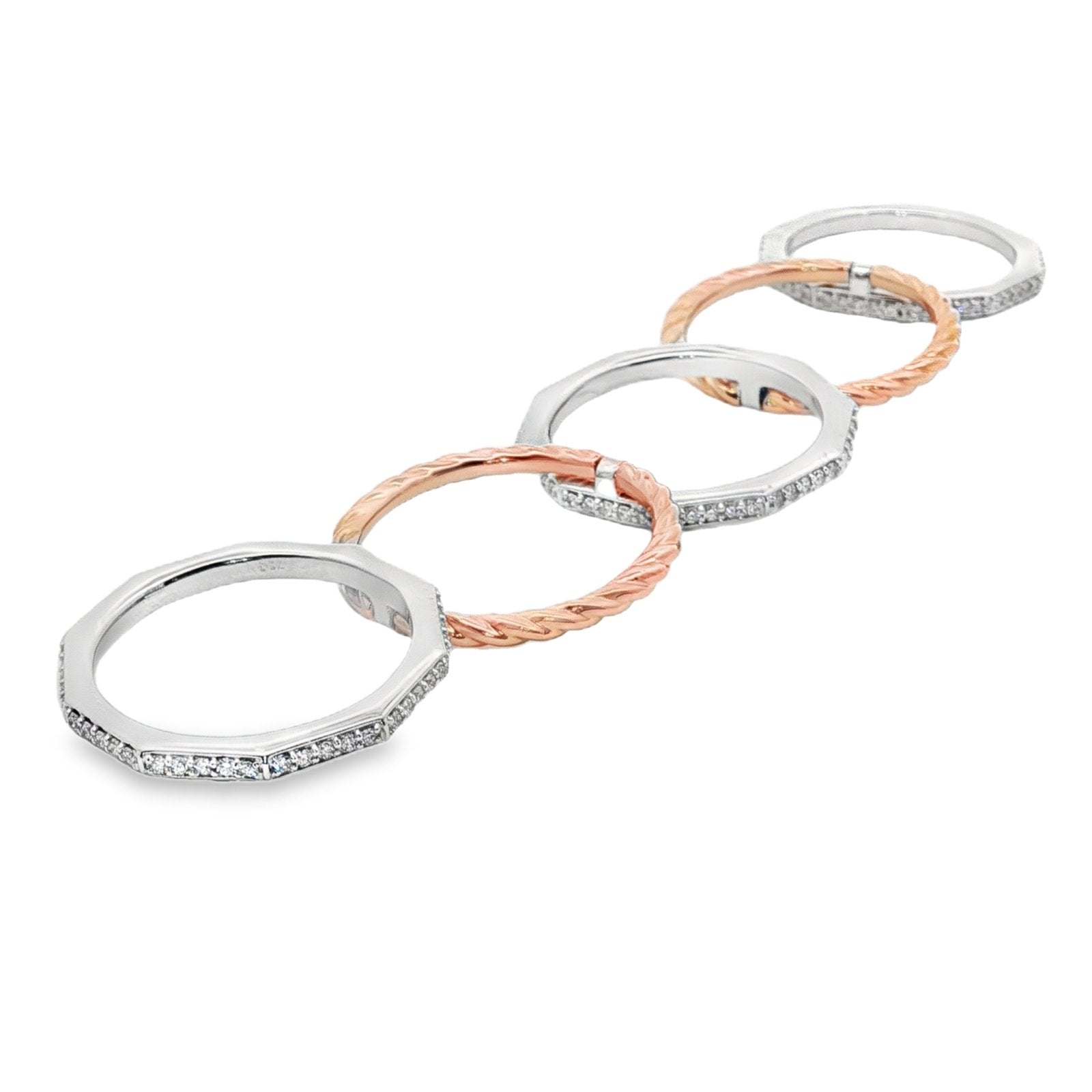 Set in 18K gold, this unique Stacked Ring features petite, artfully connected alternating bands of white and rose gold adorned with a total of 150 diamonds weighing 0.89CTS. For ring sizes, please inquire above.