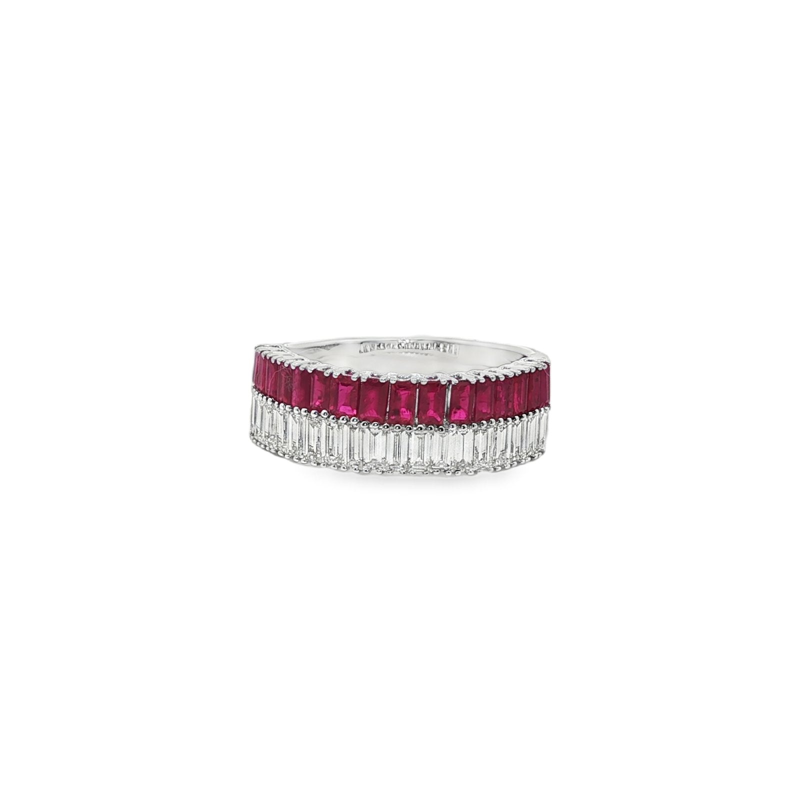 Set in 14K white gold, this elegant Baguette-cut Ring features a smoothly polished graduated band adorned with two rows of light-catching gemstones: sixteen vibrant rubies totaling 1.02CTS and eighteen sparkling diamonds weighing another 0.98CTS. For ring sizes, please inquire above.