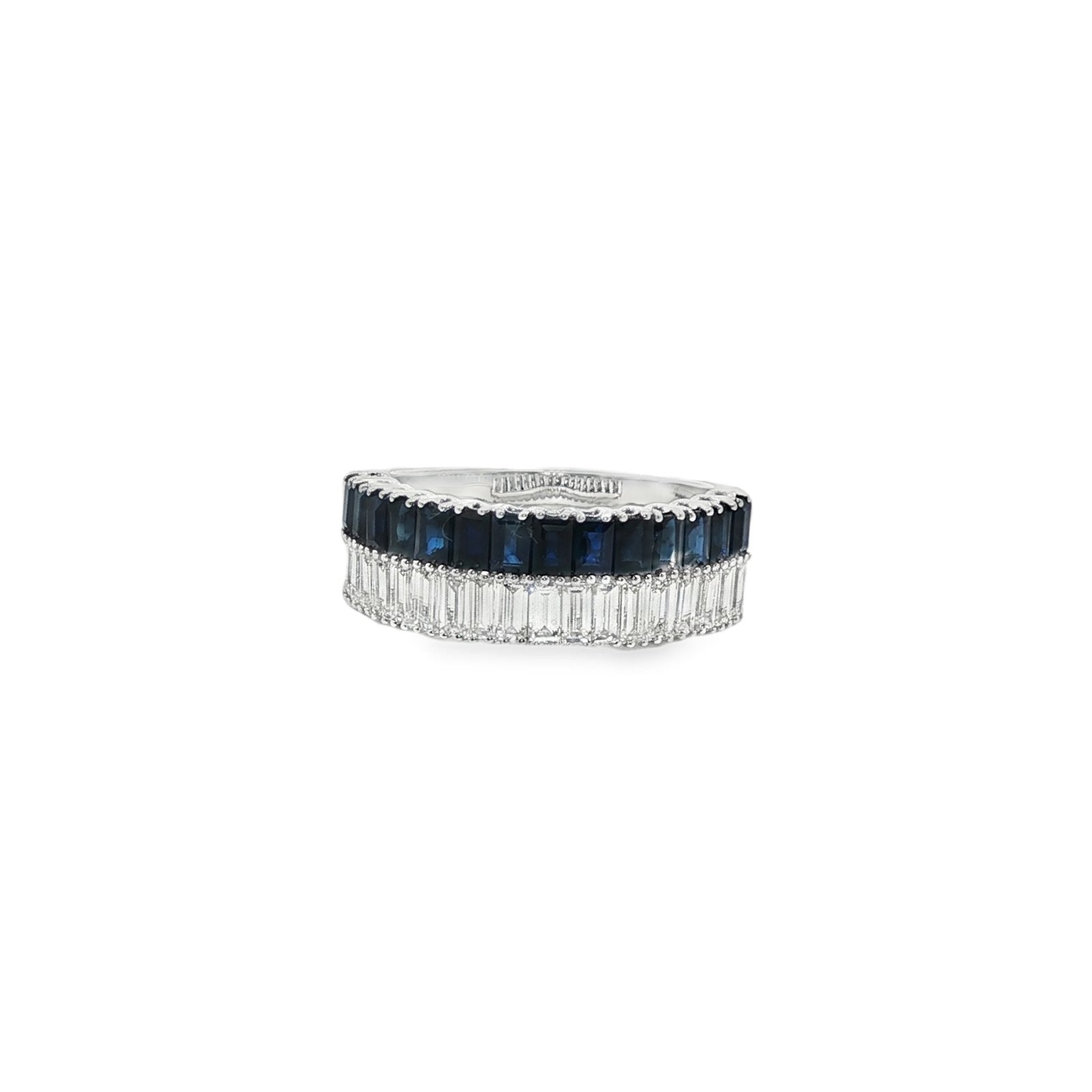Set in 14K white gold, this elegant Baguette-cut Ring features a smoothly polished graduated band adorned with two rows of light-catching gemstones: fourteen deep blue sapphires totaling 1.51CTS and eighteen sparkling diamonds weighing another 0.97CTS. For ring sizes, please inquire above.