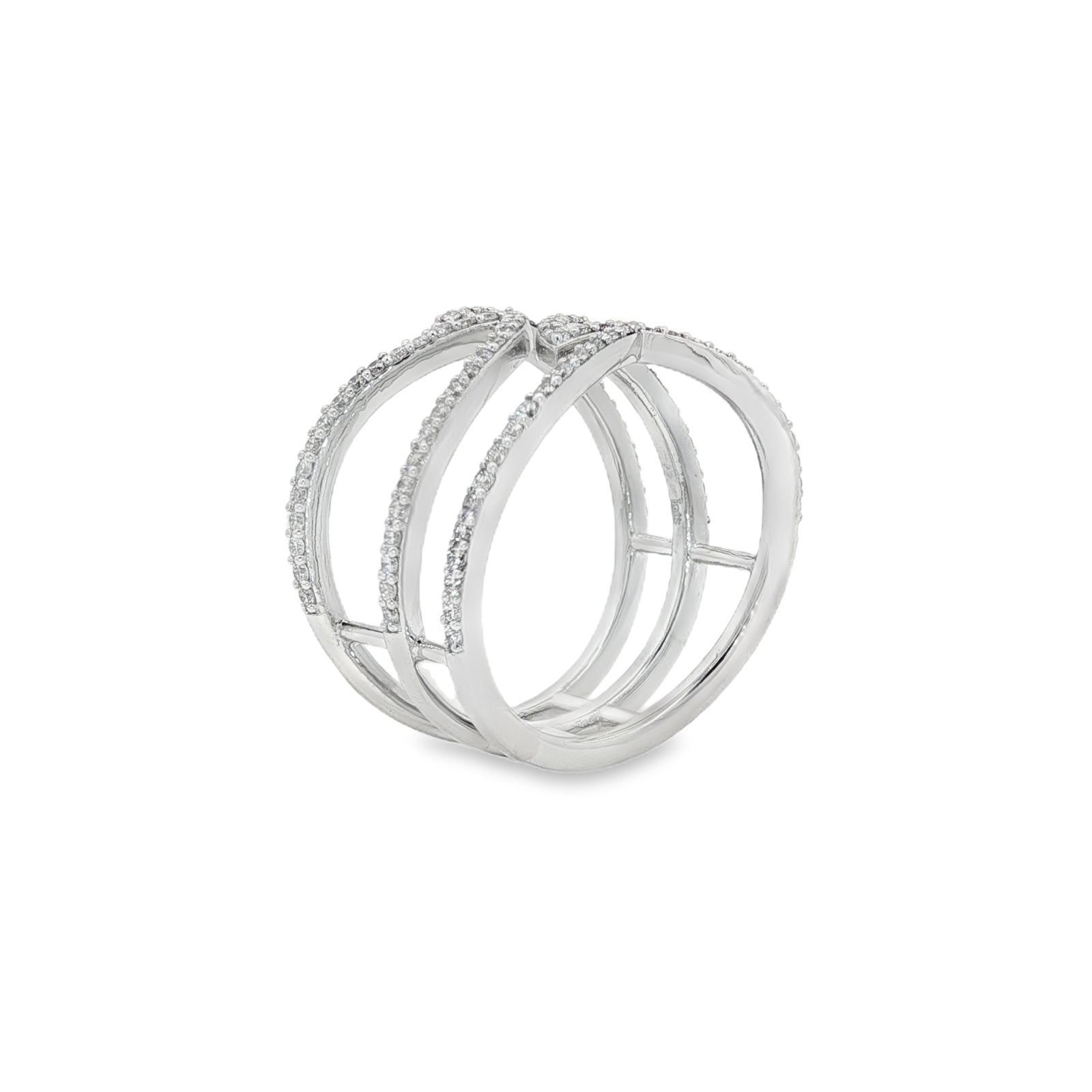 Set in 18K white gold, this eye-catching Diamond Ring features a wide-set band comprised of petite, artfully crafted strands adorned with 102 sparkling diamonds weighing 0.607CTS, as well as a smoothly polished finish. For ring sizes, please inquire above.