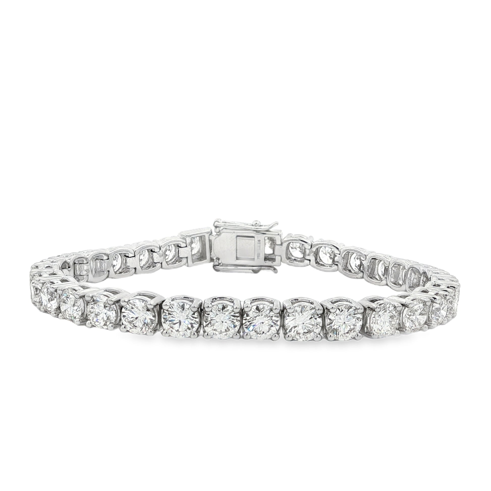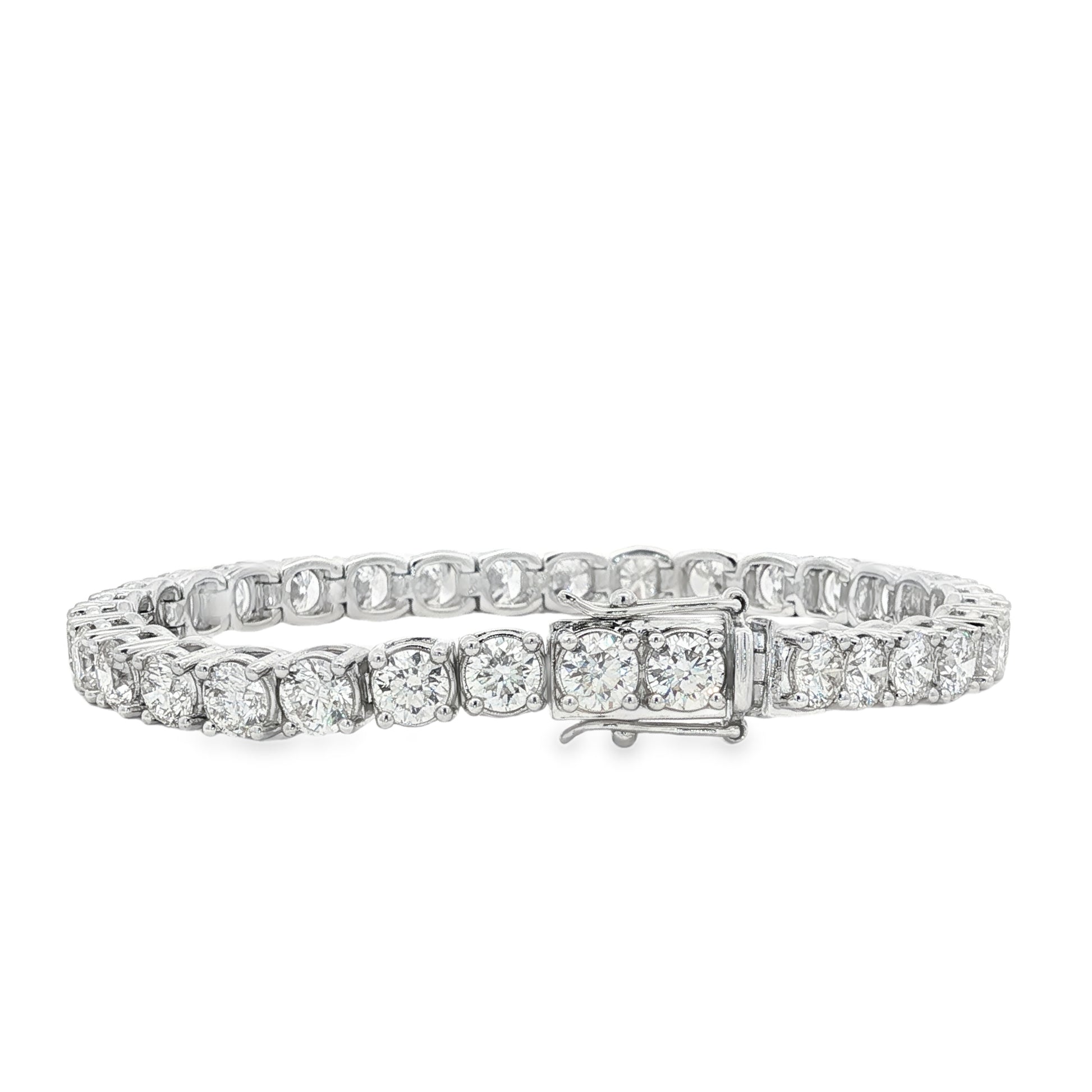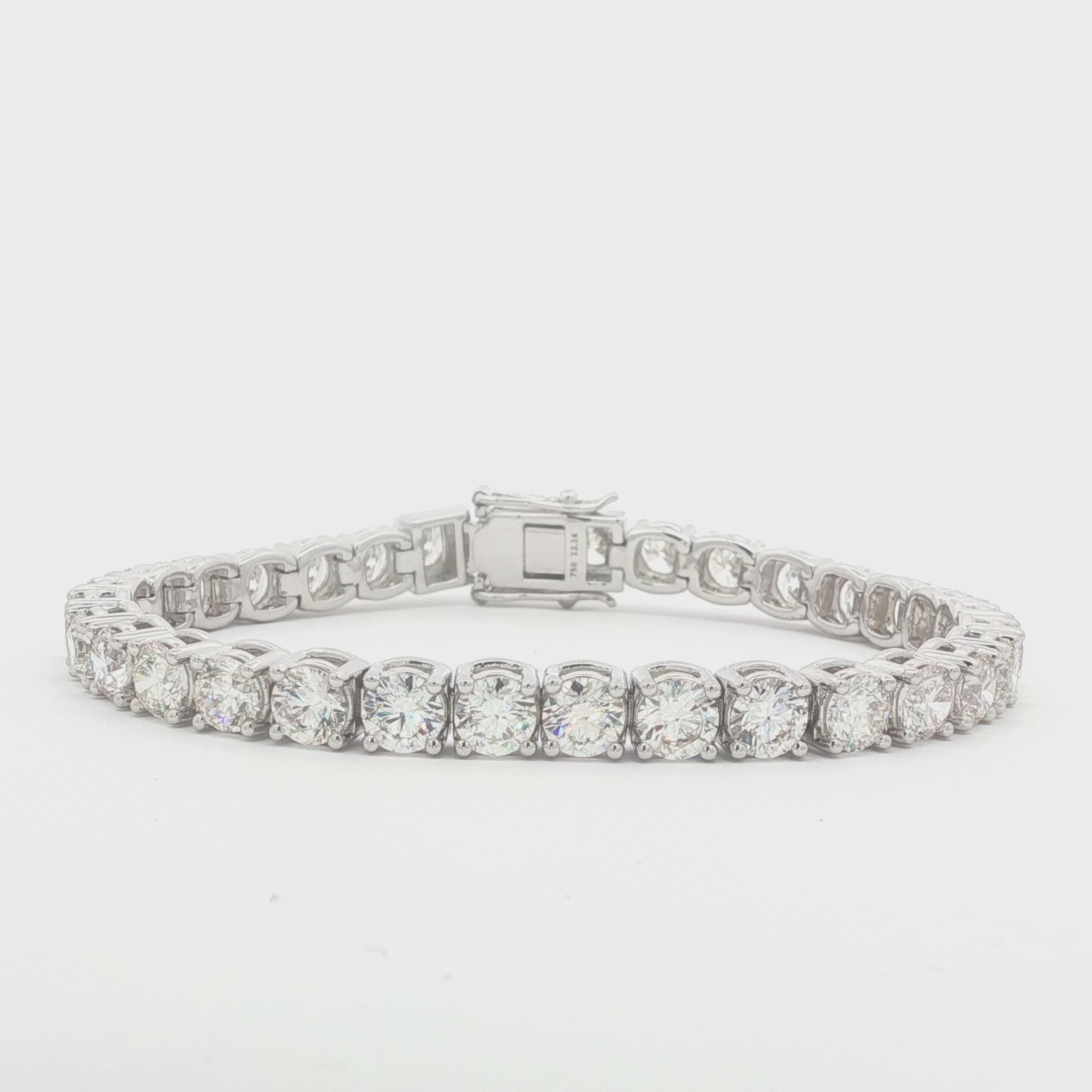 This striking Diamond Tennis Bracelet, set in 18K white gold, features a series of thirty-two diamonds weighing an incredible 12.16CTS, G/H in color, and VS in clarity; a subtle yet glamorous accessory for any formal look.