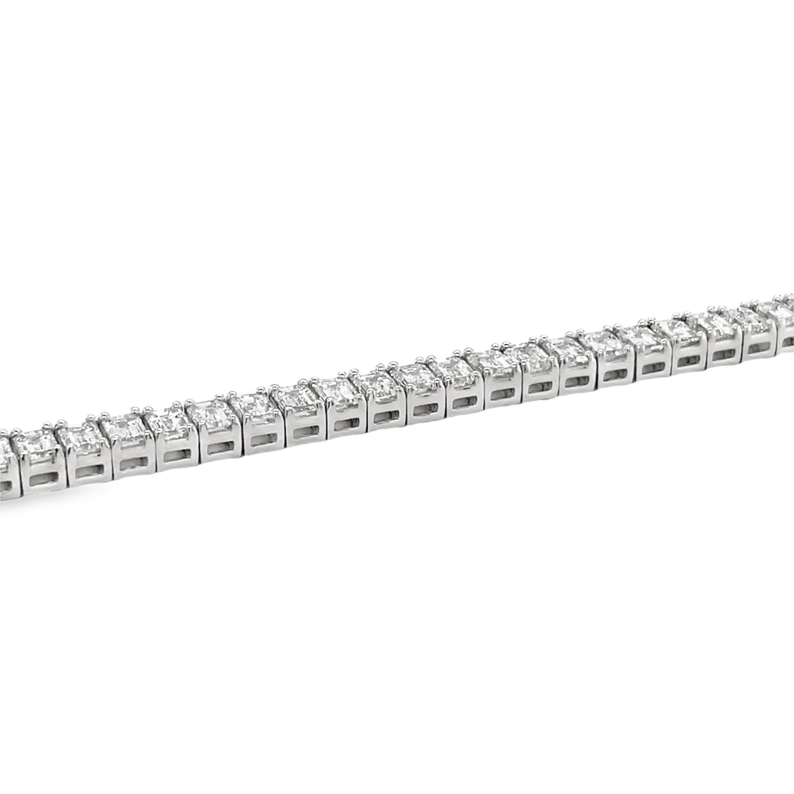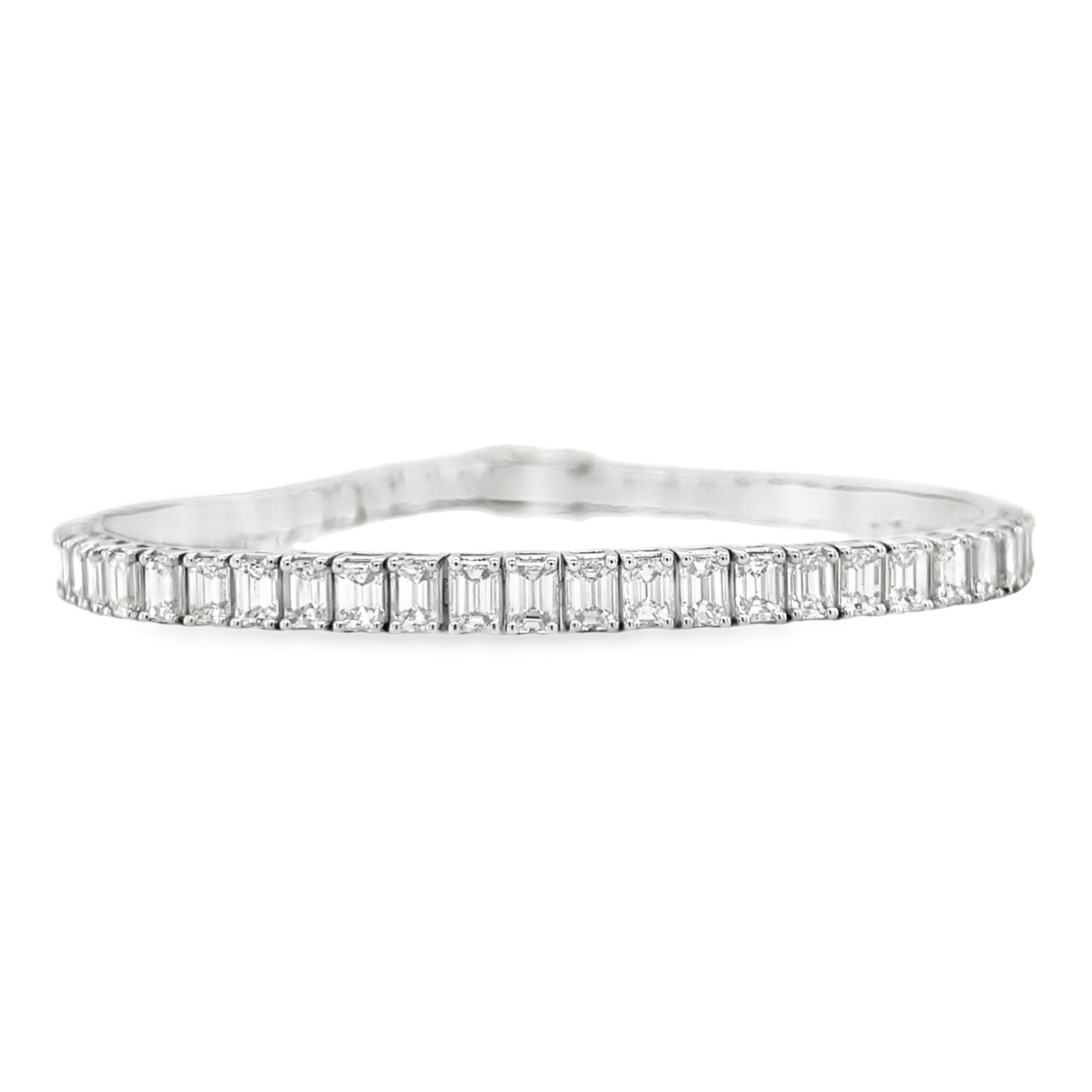 Set in 18K white gold, this light-catching Tennis Bracelet features a series of smooth, highly polished settings adorned with sixty sparkling emerald-cut diamonds weighing a total of 9.006CTS. A striking accessory sure to make a statement.