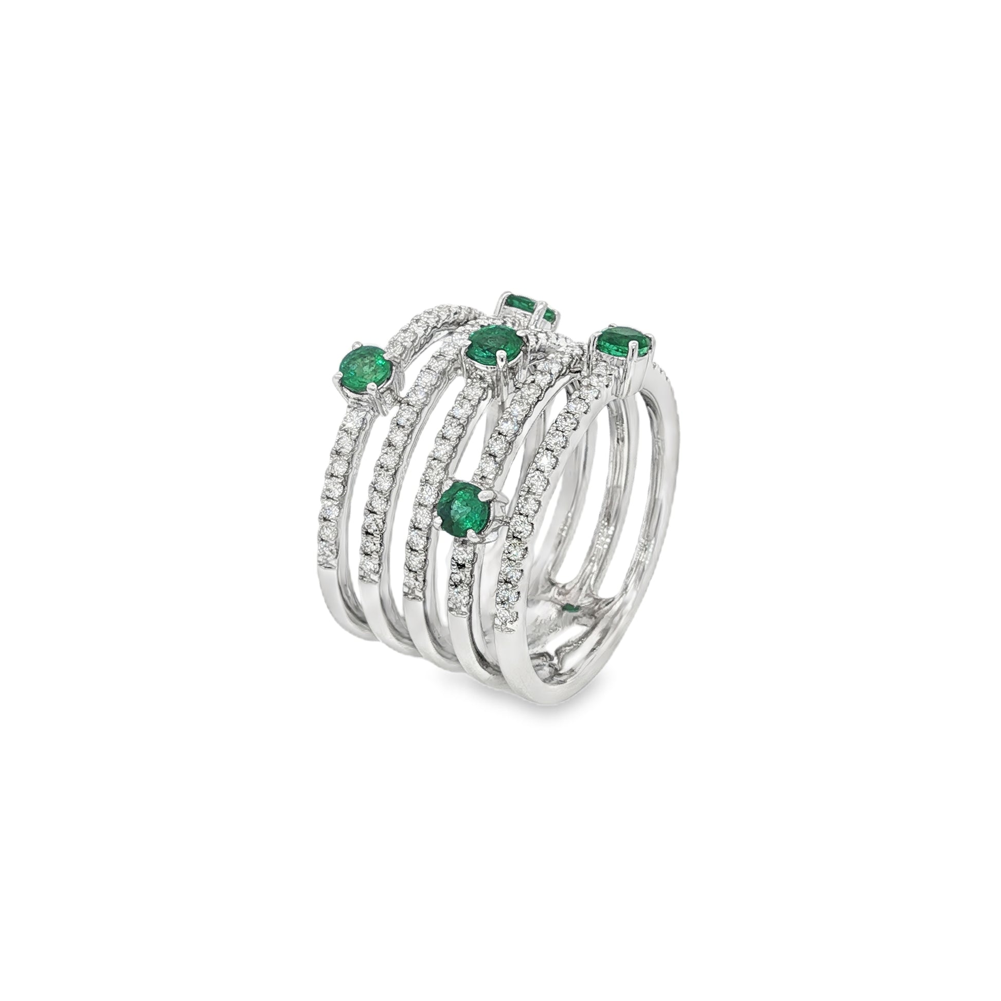 Set in 18K white gold and part of Jai's Gemstone Gallery, this stylish Five-strand Ring features petite, stacked bands adorned with 100 diamonds totaling 0.76CTS. Along each band sit vibrant green emeralds, weighing a total of 0.62CTS, adding a pop of eye-catching color. For ring sizes, please inquire above.