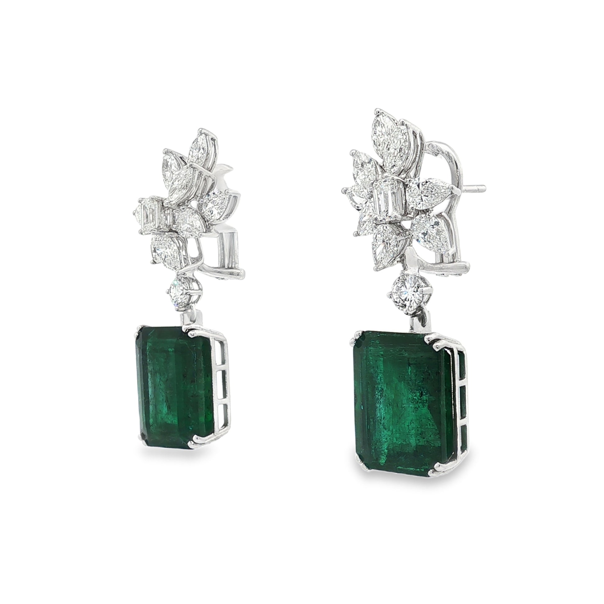 Set in 18K white gold and part of Jai's Gemstone Gallery, these eye-catching Floral Drop Earrings feature vibrant green emeralds weighing a noteworthy total of 23.01CTS. Atop these gemstones sit sparkling floral adornments comprised of twenty diamonds varying in shape—round, pear, marquise, and emerald-cut—weighing a total of 5.07CTS.