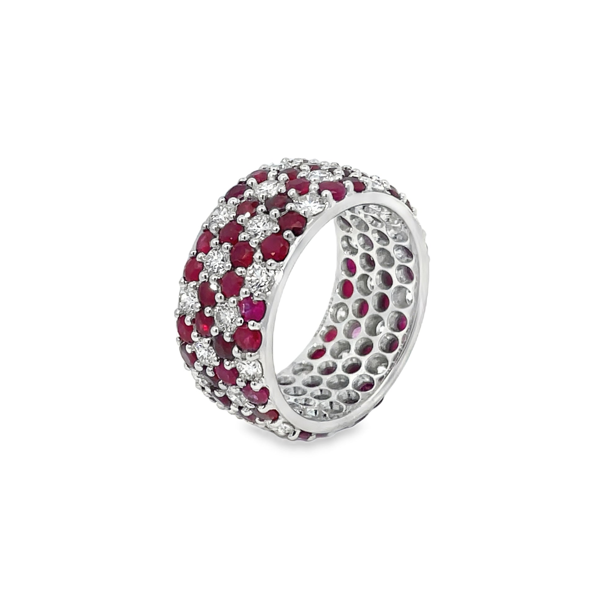 Set in 18K white gold, this beautiful Floral Ring features a thick, smoothly polished band comprised of thirty-six sparkling diamonds—weighing 2.063CTS—and seventy-two vibrant rubies—weighing another 4.266CTS—artfully set in a floral pattern. For ring sizes, please inquire above.