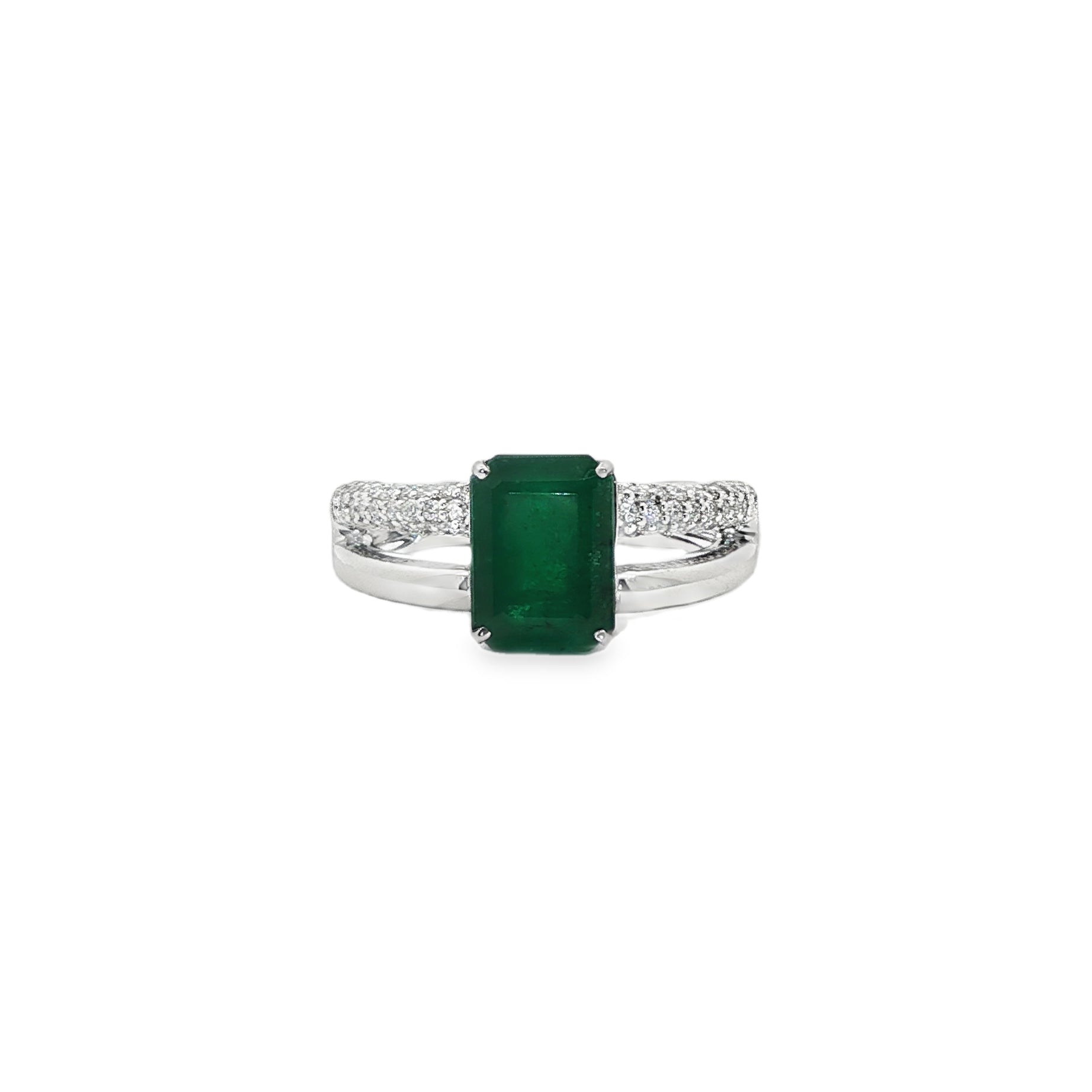 Set in 18K white gold and part of Jai's Gemstone Gallery, this elegant Emerald Ring features a band comprised of two strands; one with a smoothly polished finish and the other adorned with 100 diamonds weighing a total of 0.42CTS. At its center sits a vibrant green, 2.95CT, octagon-cut emerald. For ring sizes, please inquire above.