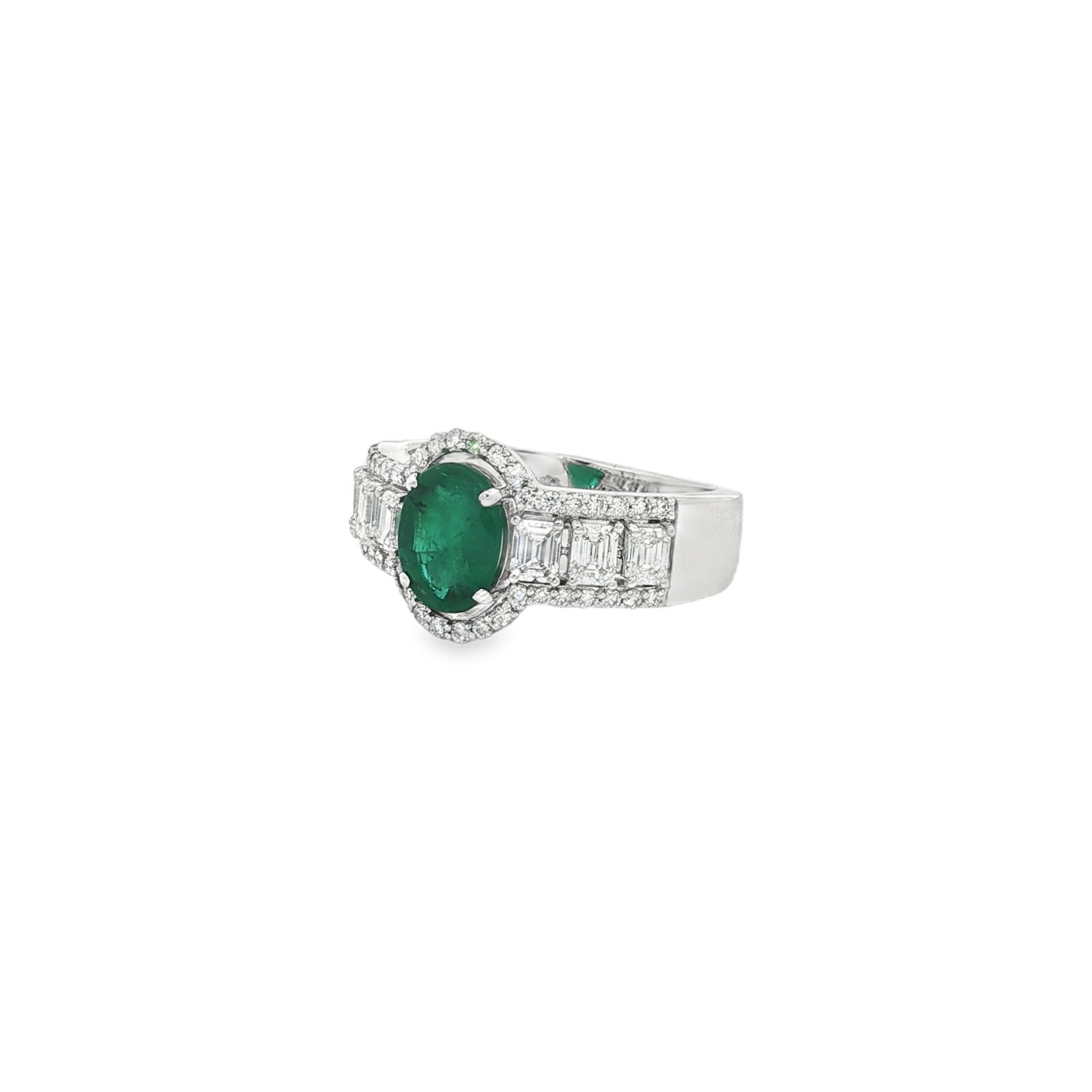 Set in 18K white gold and part of Jai's Gemstone Gallery, this elegant Emerald Ring features a band comprised of six emerald-cut diamonds and forty round diamonds, weighing a total of 1.08CTS. At the band's center sits an eye-catching vibrant green, 1.28CT, oval-cut emerald. For ring sizes, please inquire above.