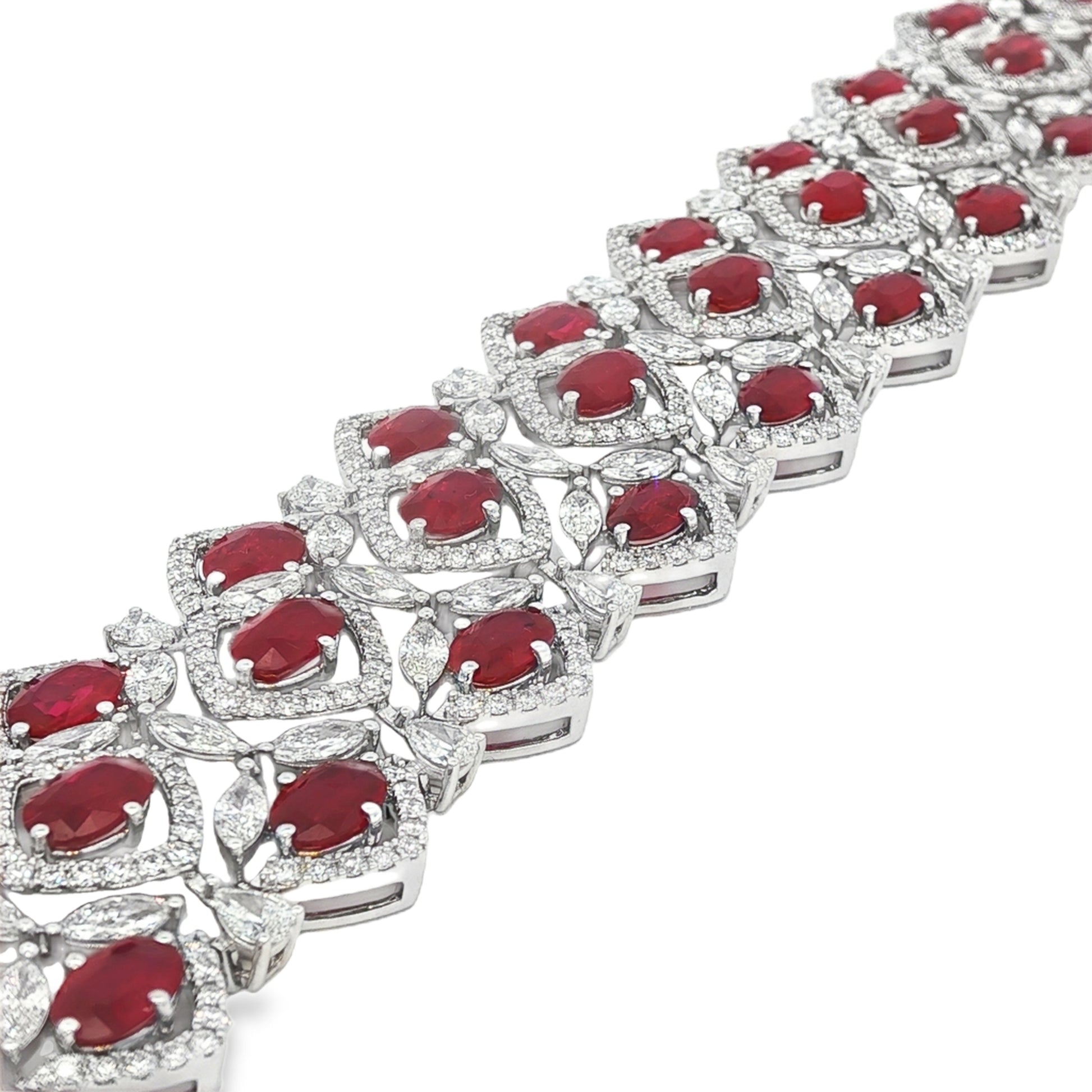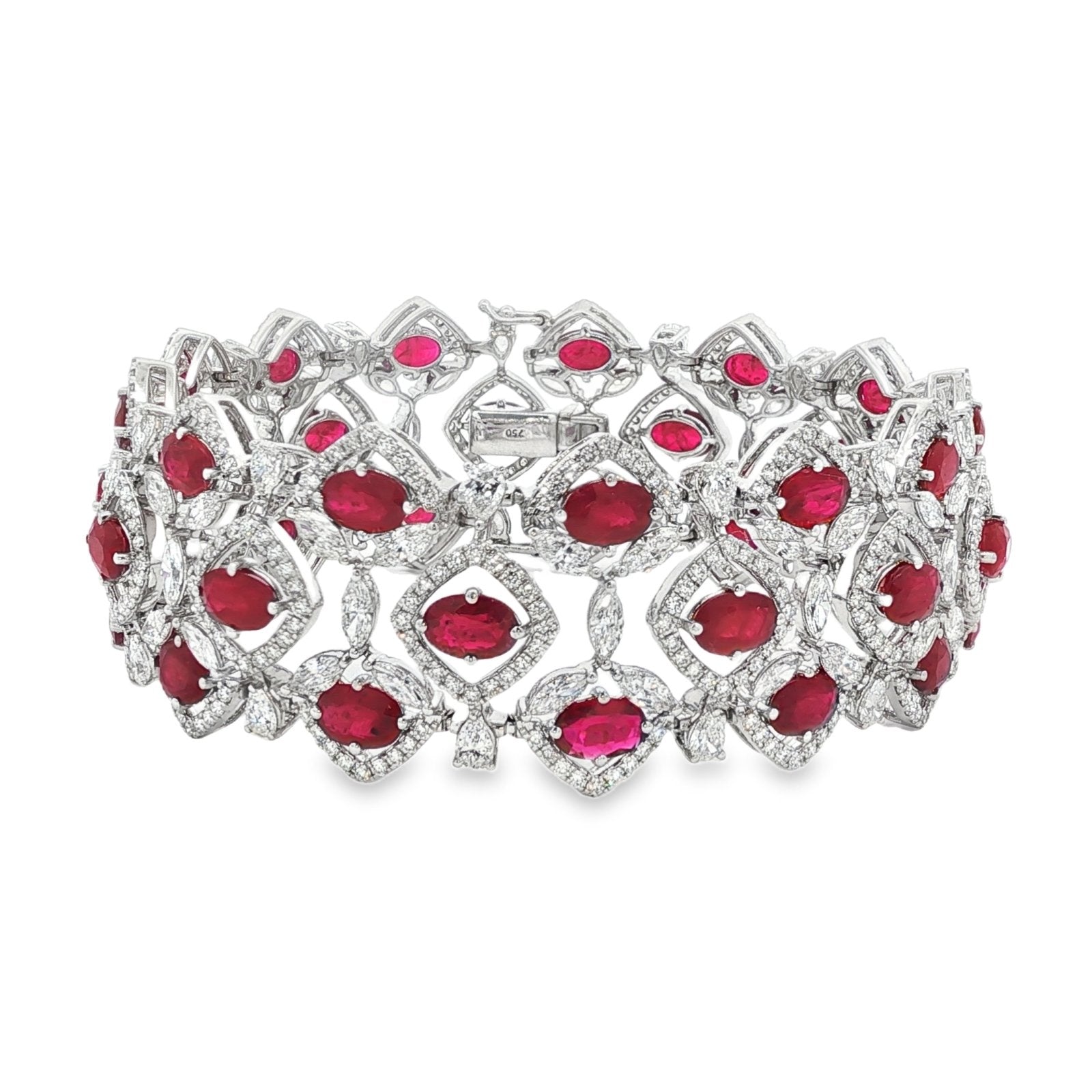 Set in 18K white gold and part of Jai's Gemstone Gallery, this eye-catching Ruby Bracelet features a strap of artfully crafted settings adorned with thirty-nine oval-cut rubies weighing a remarkable 18.49CTS. Surrounding these vibrant gemstones sit an array of 585 sparkling diamonds varying in shape—round, pear, and marquise-cut—weighing another 10.98CTS.