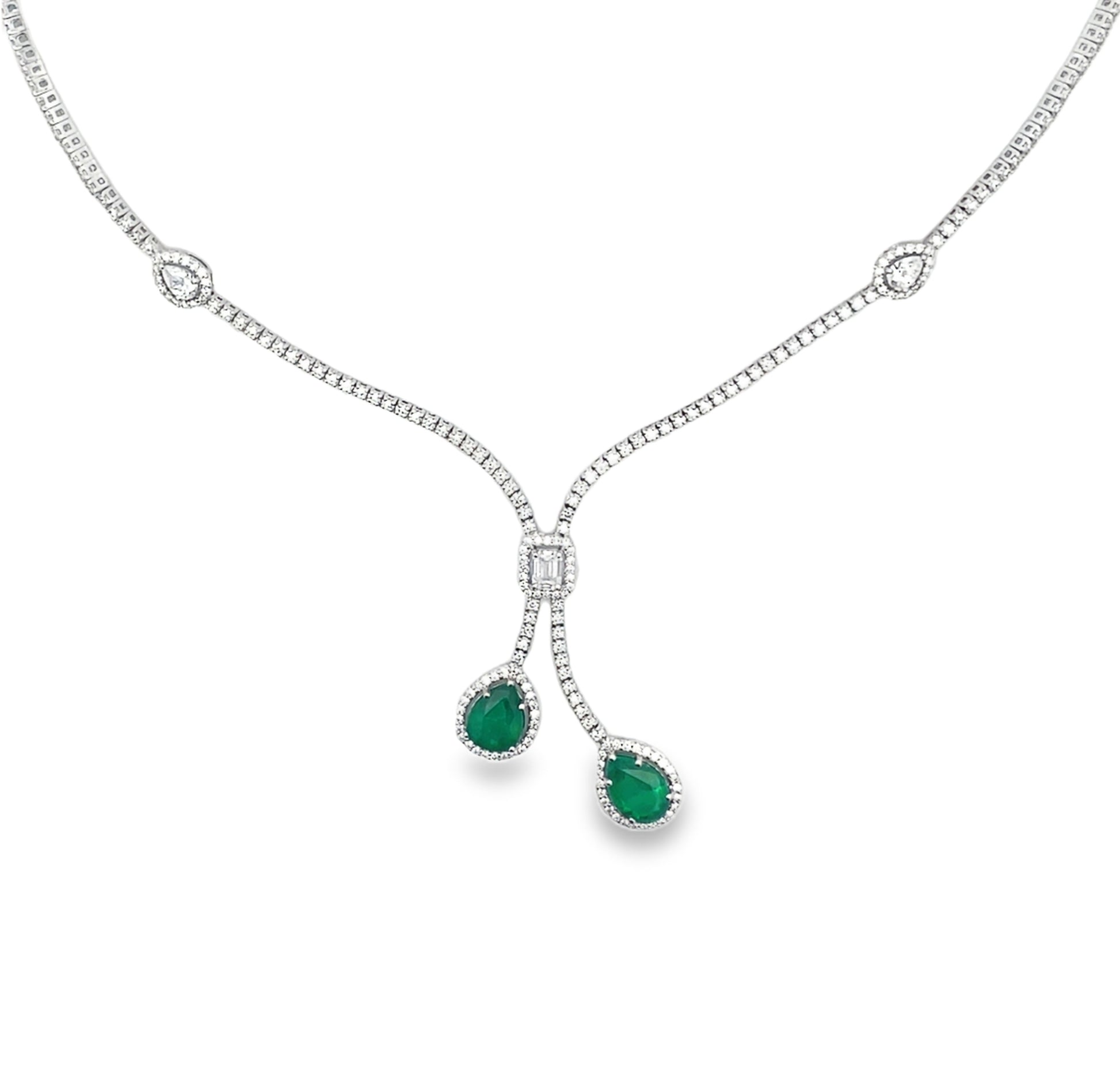 Set in 18K white gold, this eye-catching Emerald & Diamond Necklace features a remarkable 362 diamonds weighing 6.91CTS: delicate strands adorned with two pear-cut diamonds share an emerald-cut station. At this piece's focal point sit two vibrant green pear-cut emeralds, weighing another 2.93CTS.
