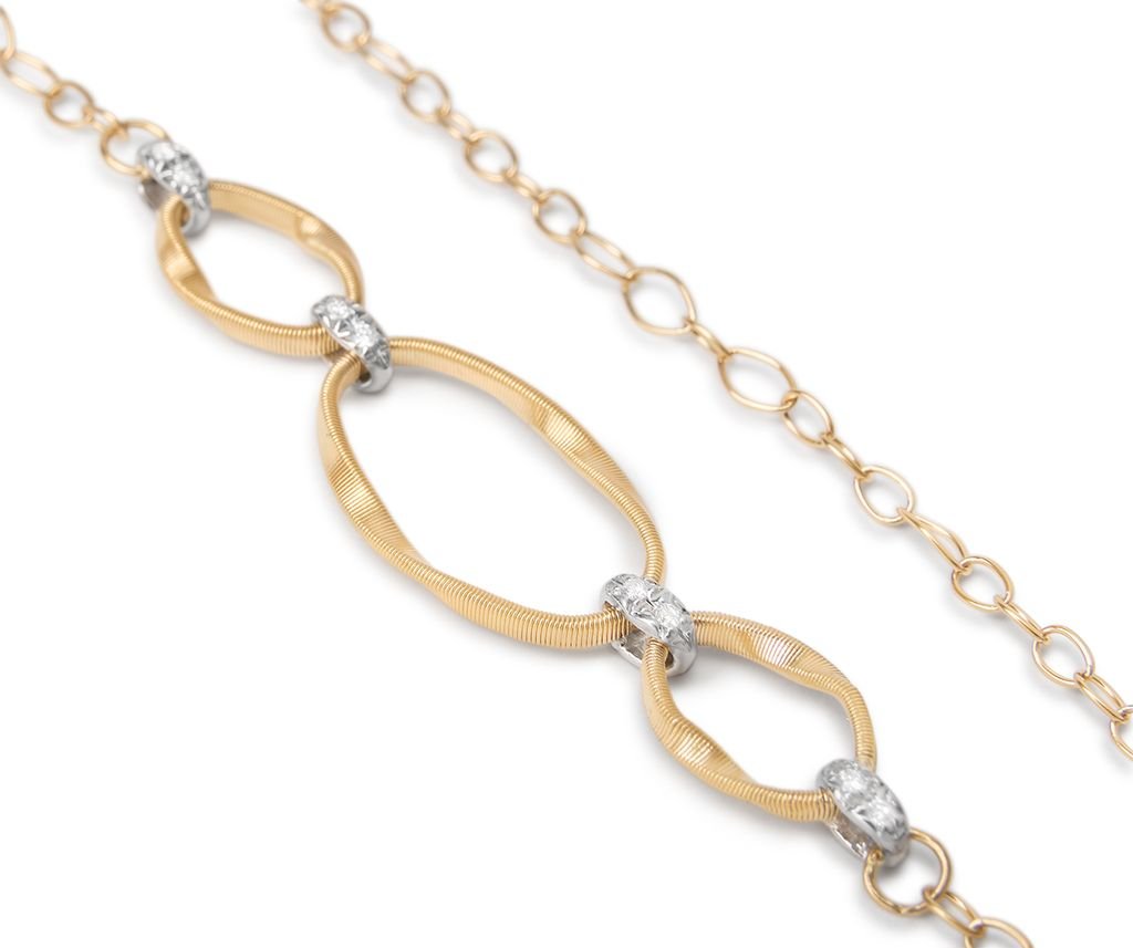 Timeless elegance and contemporary style come together in these carefully hand-hammered, twisted 18K yellow gold coils intertwined to create a sensual and uniquely modern accessory. Connected by white gold links, this two-tone Diamond Necklace from Marco Bicego's Marrakech Onde Collection also features diamonds totaling 0.06CTS.