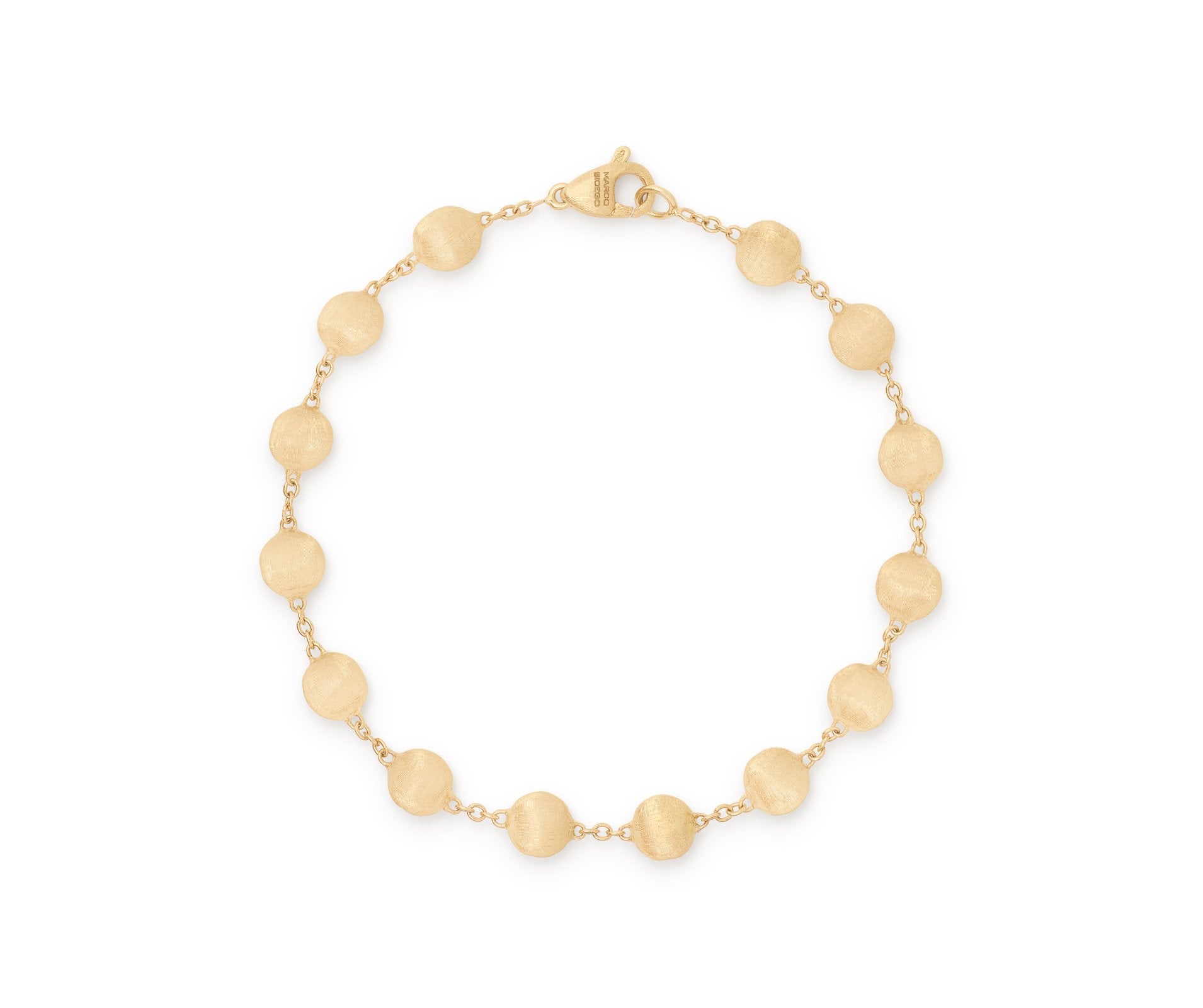 Sculptural, harmonious and irresistibly sensual jewelry. Set in 18K yellow gold, this elegant Bead Bracelet from Marco Bicego's Africa Collection features a series of delicate links adorned carefully spaced, satin-like beads hand-engraved using an ancient Florentine technique.