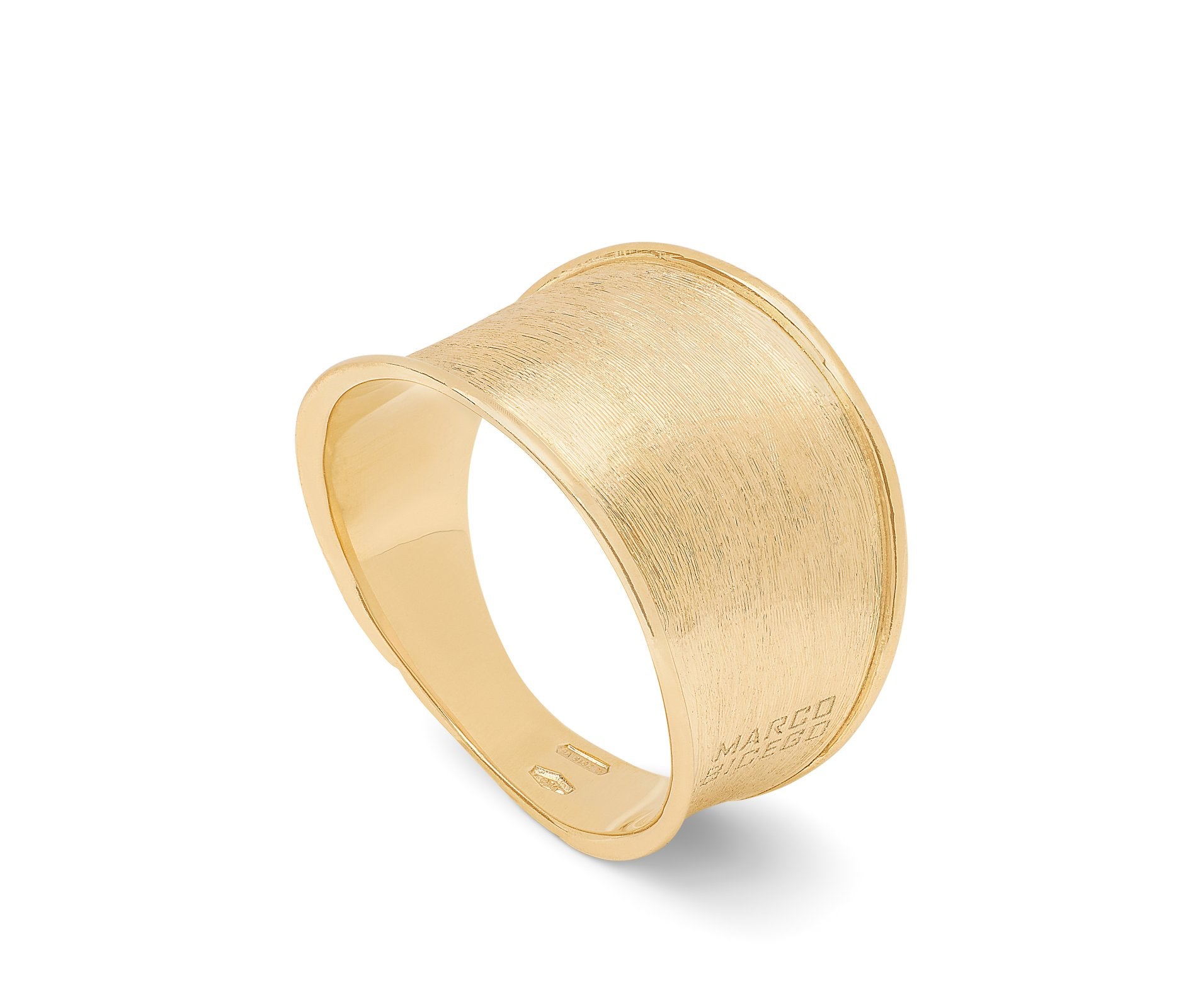 Set in 18K gold and hand-engraved using a well-established Florentine technique creating a tactile and satin-like finish, this Satin Ring from Marco Bicego's Lunaria Collection features a wide, brushed yellow gold band. For ring sizes, please inquire above.