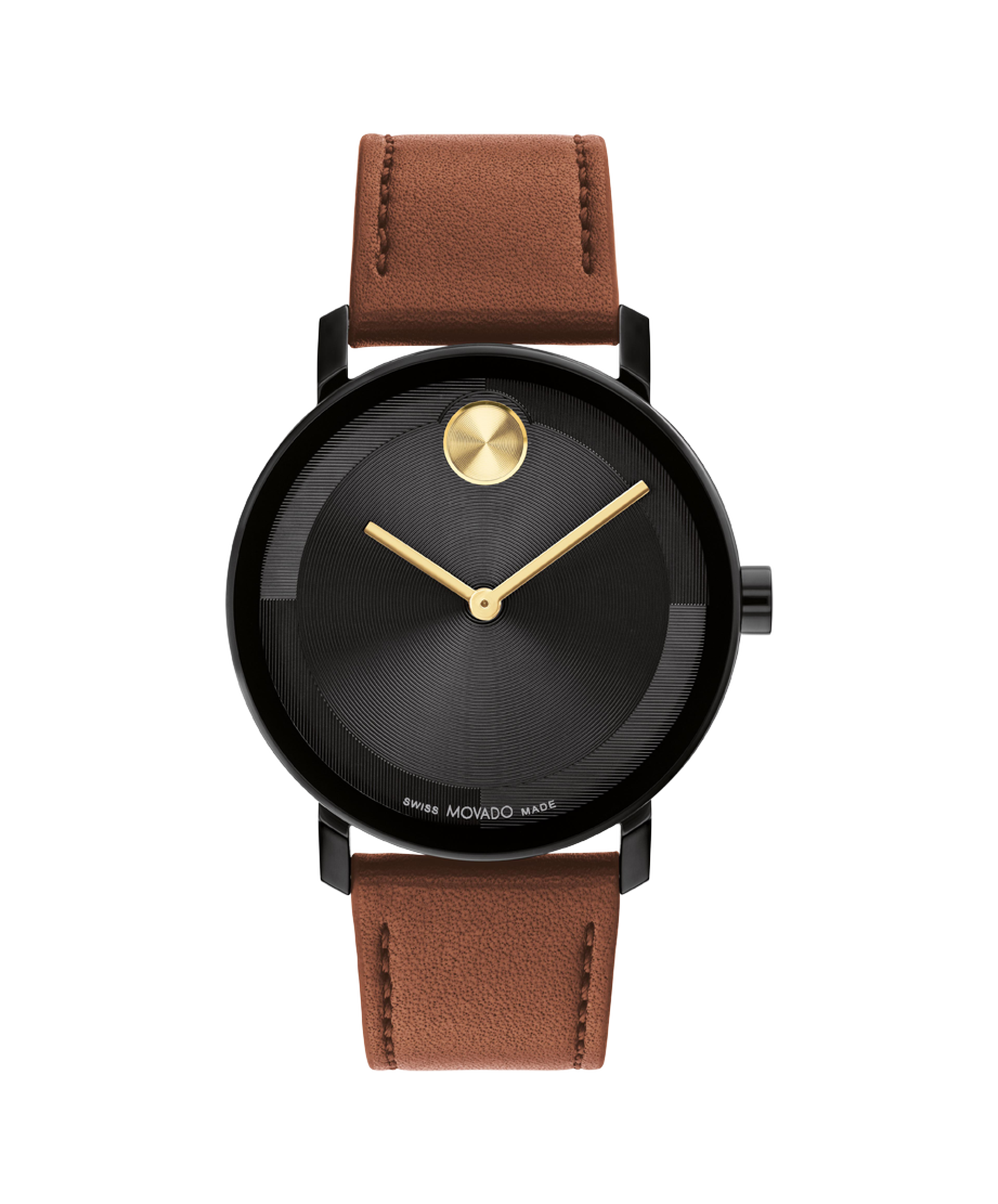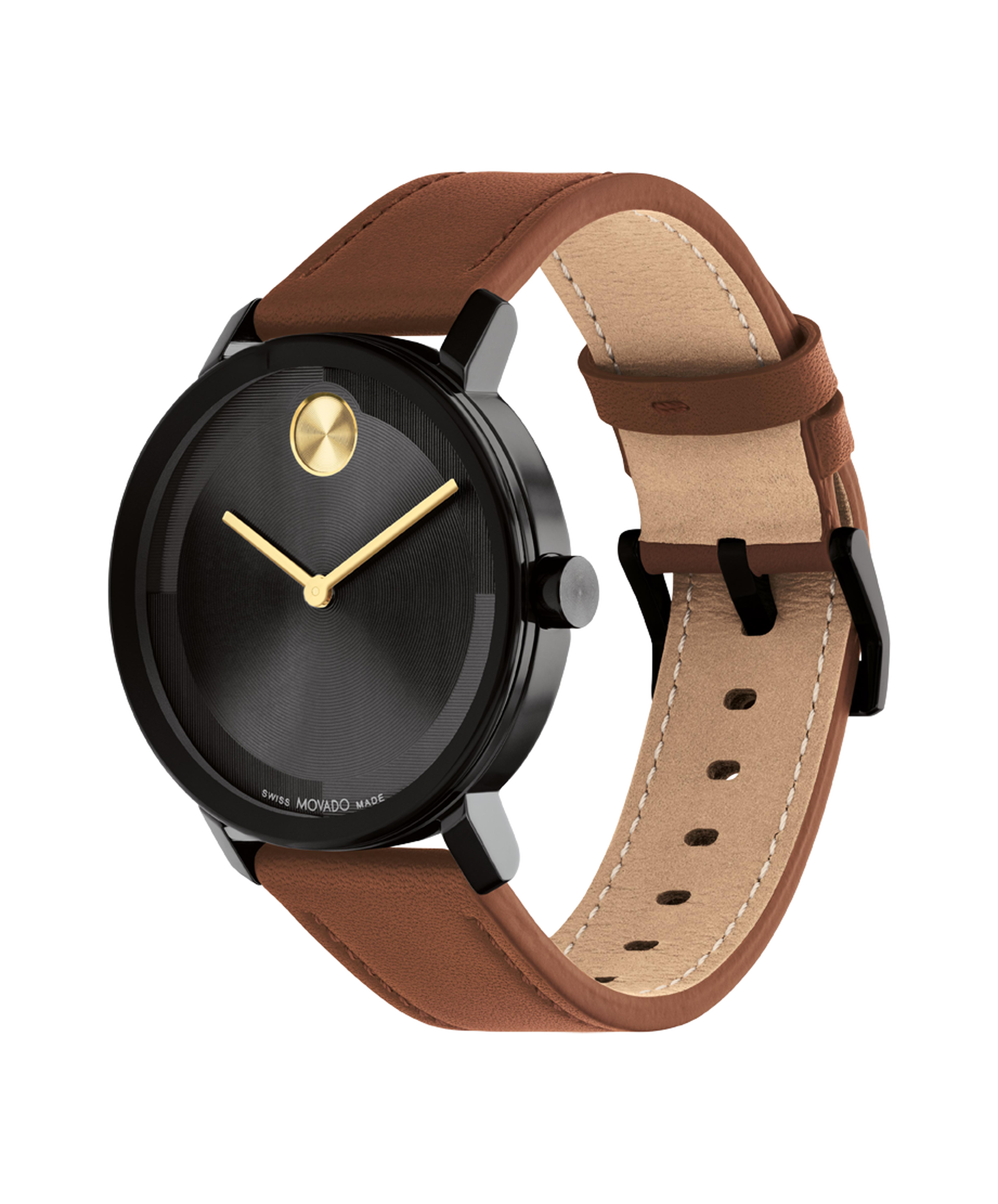 The evolution of modern design with a sharp look and elevated feel. This Movado BOLD Evolution 2.0 features a black museum dial, set within a 40MM black ion-plated stainless steel case; it also has cognac nappa leather straps, Swiss quartz movement, and a water resistance of up to 3 ATM (30 meters or, approximately, 100 feet).