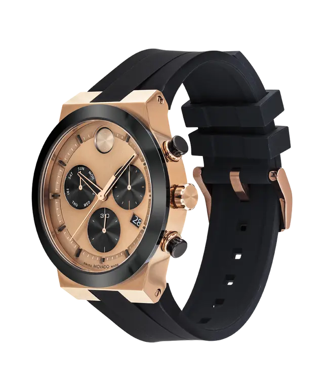 Movado's BOLD Fusion watch features a rose gold-toned chronograph dial, set within a 44.5MM rose gold-toned ion-plated stainless steel case; it also has a black silicone strap, Swiss quartz chronograph movement and a water resistance of up to 5 ATM (50 meters or, approximately, 164 feet).